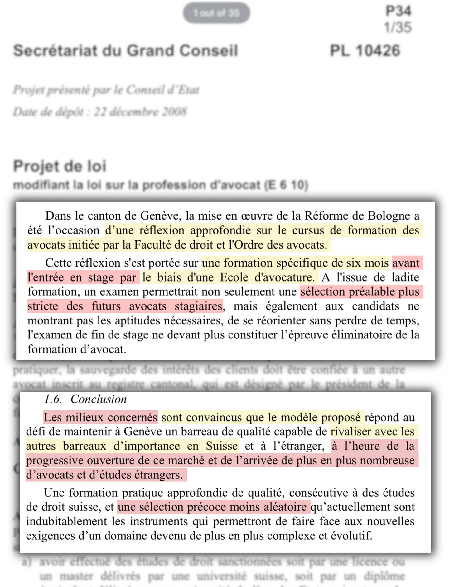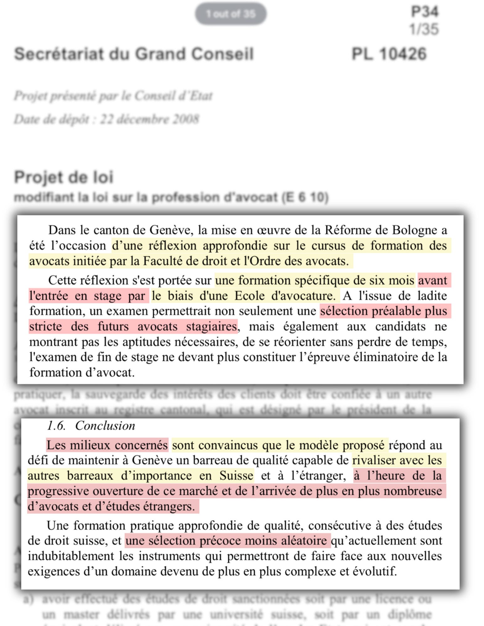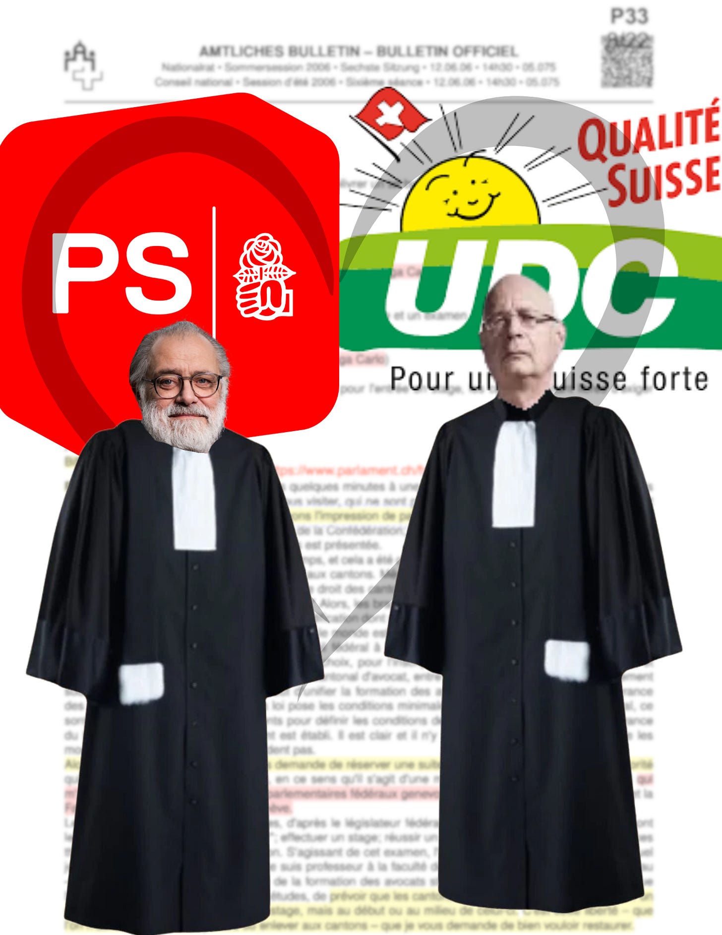 Maître Jacques PAGAN (UDC - droite de la droite), minoritaire, s’allie à Maître Carlo SOMMARUGA (PS), rapporteur de la majorité. Ensemble, ils défendent le modèle local. Master obligatoire, formation initiale préalable, examen anticipé — un triptyque propre à Genève, étranger au reste du pays.
